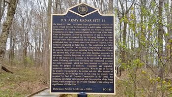 Bethany Beach WWII Radar Site (2) (1942-1946) - A World War II U.S. Army Air Warning Service (AWS) Radar Site established in 1942. Used to provide early warning of enemy aircraft approaching the Delaware Coast. Located near the community of Ocean View in Sussex County, Delaware. Deactivated in 1946. Reactivated in 1957 as the U.S. Air Force Bethany Beach Gap-Filler Annex. Deactivated in 1968. Also known as AWS Station 11. HistoryThis radar site became operational during World War II early in 1942 as a part of a chain of radar stations along the East Coast of the United States and Canada. These secret radar sites were built to provide early warning of approaching enemy aircraft and ships but also served to assist friendly aircraft that were lost or had in-flight emergencies. The U.S. Army purchased the land for Site 11 on l2 Mar 1941 for $1,333. The land survey and site preparations were complete by September 1941, three months before the start of World War II. Engineering and construction of the 14-acre site were conducted by the United States Army Corps of Engineers (USACE). The radar unit and 100-foot tower were installed by February 1942. Site construction continued until June 1942 when the site became operational. Initially built as a mobile site, it was converted to a permanent site on 22 Aug 1942. Cost of construction is listed as $70,322. The capacity of the site was shown as 69 men and 12 officers on 31 Dec 1945. AWS Site 11 initially operated an SCR-270-C radar set with the antenna mounted atop a 100-foot steel tower. This radar set was a search radar capable of detecting aircraft flying at 25 thousand feet at a range of 110 miles. It is likely that this site, because of the proximity to Fort Miles and the Delaware River munitions facilities, would have been upgraded to more modern equipment toward the end of the war. Physical PlantA 1942 map indicates 17 facility structures on the site divided into a cantonment area on the south end and an operations area on the north end. The cantonment area included quarters for officers and enlisted, supply and administration, a Dining hall, recreation facilities, two guard shacks and other support buildings. The operations area included the radar building, the radar tower, and two guard shacks. The two areas were separated by a large area with no buildings except a pump house that is now the only remaining structure.
