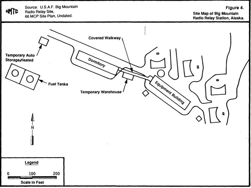 Big Mountain White Alice Communications Site (1957-1979) - A Cold War U.S. Air Force Communications Station, a part of the Alaska White Alice Communications System (WACS). Located 28 air miles from Iliamna, Alaska. The site system ID was "BMX". After HF radio systems proved inadequate for command and control communications in Alaska, the Air Force implemented the White Alice Communications System (WACS). This was a system of tropospheric scatter and microwave radio relay sites constructed during the mid-1950s and 1960s to provide reliable communications to Alaska Air Command (AAC) AC&W radar system. The system came to encompass facilities for the Distant Early Warning (DEW) Line and the Ballistic Missile Early Warning System (BMEWS) in Alaska. While some of the WACS microwave sites remain active the WACS tropo sites were closed circa 1979 as communications technology rapidly changed to embrace communications satellites. This site was built between 1956-1957 and was officially activated on 7 Sep 1957. This was a split site with the radio relay equipment and crew quarters on the upper site. The lower site was adjacent to a gravel airstrip and provided a staging area for airlifted equipment, supplies and personnel. Facilities at the lower site included three fuel tanks (two 1,000-gallon and one 42,400-gallon), a small vehicle repair shop and a small flight operations building. The access road to the upper site started at the runway and wound up to the upper site. Original facilities on the upper site included a 7,200 square-foot equipment/power building, a 7,200 square-foot 16-person dormitory, a temporary storage building and two above ground fuel storage tanks. Radio relay equipment on the upper site included two pairs of 60' billboard tropo antennas and a pair of 30' tropo dish antennas. The 30' antennas operated at 1 kW each while the 60' antennas operated at 10 kW each. The Big Mountain WACS site was a Tropo and Microwave station linking Diamond Ridge, King Salmon, Sparrevohn and locally the town of Iliamna. One pair of 60' tropo antennas faced Diamond Ridge (128 miles), a second pair linked Sparrevohn (120 miles) and a pair of 30’ dishes linked to King Salmon (70 miles). There was also a link across Lake Iliamna to the town of Iliamna. Alaska Telephone Switching Station (ATSS-4A) switching capability was added in 1969 to Pedro Dome, Big Mountain, Neklasson Lake and Kalakaket Creek. These four facilities formed a large rectangle and were linked so that if one facility failed, circuits would be switched so that the other three could still communicate. The specific links from Big Mountain WACS (BMX) as/of July 1977 were: