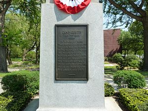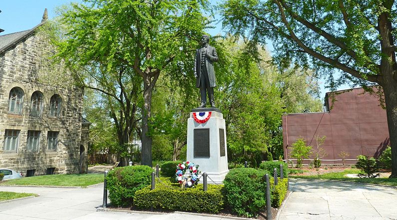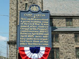 Camp Curtin (1861-1865) - A U.S. Civil War mobilization camp established in 1861 by Union forces in Harrisburg, Dauphin County, Pennsylvania. Named for then Governor Andrew G. Curtin. Abandoned at the end of the war in 1865. U.S. Civil War (1861-1865)Camp Curtin was established in Harrisburg as a Union training and mobilization center in April 1861 by Pennsylvania Governor Andrew G. Curtin. The camp became one of the largest Union moilization camps as a result of its proximity to the railroad and Washington, DC. More military units were organized here than any other Union camp and some 300,000 troops passed through the camp. The camp site was bounded by Reel's Lane on the North, the Pennsylvania Railroad on the East, Maclay Street on the South and 5th Street on the west for a total of some 80 acres of land. The camp became so crowded that some 14 satellite camps and facilities were established for specific functions. After the end of the war Camp Curtin was used as a mustering out point for Union troops going home, it was officially closed on 1 Nov 1865. Current StatusA small state park at North 6th St. and Woodbine Street in Harrisburg, Dauphin County, Pennsylvania. The park contains a monument to Camp Curtin complete with a statue of Governor Curtin. This statue is one of four identical statues including one placed at his home, one at the Pennsylvania State Gettysburg Battlefield Memorial and one at the State Capitol Rotunda. At the base of this statue there are four plaques, two with some details of Camp Curtin and two with images of the camp. Three roadside markers are in the local area.