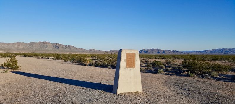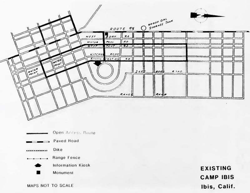 Temporary facilities constructed on the site include 28 enlisted men's shower buildings, 14 officer's shower buildings, 173 latrines, 234 various pyramided wood tent frames, and a 50,000-gallon wooden elevated storage tank. Water for the site was provided by deep well pumps. The only permanent structure constructed on the site was one 50,000-gallon concrete reservoir. At least 23 firing ranges were provided on the site. The ranges accommodated a variety of pistols, rifles, machine guns, and tank guns. Camp Ibis Army AirfieldThe U.S. Army built an airfield at Camp Ibis to support the training operations. The airfield had a single 4,500' north/south runway located on the west side and adjacent to what is now U.S. Hwy 95 about 13 miles northwest of Needles, California. ClosureCamp Ibis was declared surplus on 16 Mar 1944 and 5,760 acres were transferred from the War Department to the Department of the Interior. Leased land was returned to the various owners. Post WarRestricted use of the land continued after the war while the U.S. Army Corps of Engineers (USACE) supervised the cleanup of the hazardous material and the removal of temporary facilities. A 1951 USACE & BLM letter recommended that 20,640 acres, including 3,840 acres of the Campsite be restricted to surface use only. Another 11,520 acres were certified clear. Current StatusSurface remains only, the outline of the camp road structure and the airstrip can be seen from satellite views. A roadside marker has been placed on the east side of U.S. HWY 95 at the main entrance to the camp. The kiosk indicated in the Draft Interpretive Plan below is not at the location indicated. The central road to the camp center circle (M to C on the map below) is drivable by ordinary cars, some of the other roads may require high clearance vehicles.