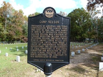 Camp Nelson (1862-1862) - A Confederate camp established as Camp Hope in 1862 during the U.S. Civil War in Lonoke County, Arkansas. Named for Brigadier General Allison Nelson. Abandoned late in 1862. HistoryA Confederate staging camp established as Camp Hope in the spring of 1862. It is estimated that as many as 20,000 Confederate troops camped in the area. A series of epidemics swept through the camp in the fall of 1862 that claimed the lives of some 1500 troops including Colonel Allison Nelson who had just been promoted to Brigadier General. The post was then re-named for the fallen Colonel. The camp was abandoned by the end of 1862. Many of the 1,500 soldiers who died were buried in scattered unmarked graves. In 1905, 429 of the graves were located and the bodies were reinterred in Camp Nelson Confederate Cemetery near the site of the original camp. An identical marker for each of the reinterred soldiers was placed in the cemetery although there is some evidence that all of the reinterred soldiers were buried in a common grave. Each of the markers read "Unknown Soldier CSA".