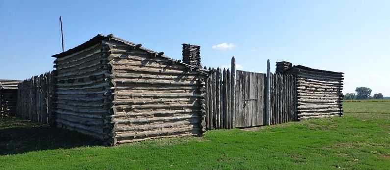 Camp River Dubois (1803-1804) - Established in 1803 by the Lewis and Clark Expedition on the east bank of the Mississippi River in present day Madison County, Illinois. Named for the nearby Wood River, then known by the French as the River Dubois. Abandoned in 1804 when the expedition departed. Also known as Camp Dubois. HistoryCamp River Dubois was established 13 Dec 1803 by the initial cadre of the Lewis & Clark Expedition to serve as a base camp for gathering men and supplies for their journey. The camp was a stockade with four buildings making up the corners and a single larger building at the center. The expedition spent the winter of 1803-1804 at the camp preparing for the two year trip. They left Camp River Dubois on 14 May 1804 and headed up the Missouri River toward the west coast. They spent the winter of 1804-1805 at Fort Mandan (1) in present day North Dakota. They reached the Pacific Ocean on 7 Nov 1805 at present day Cape Disappointment in Washington State. Their camp at the mouth of the Columbia River was called Fort Clatsop and was similar in design and construction to Camp River Dubois. After spending the winter of 1805-1806 at Fort Clatsop the expedition returned to Illinois, arriving on 23 Sep 1806. Current StatusMust See! The camp is recreated in the Lewis & Clark State Historic Site, Madison County, Illinois. The museum in the visitor's center has an exceptional cutaway keel boat display that shows the complete 55' keel boat. One side of the boat is cut away to reveal the inside and illustrate how the supplies and cargo for the two year journey were stowed.
