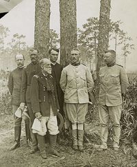 Camp Tampa (1898-1898) - The primary Spanish American War organization and embarkation camp in Tampa, Hillsborough County, Florida, established in 1898. Abandoned in 1898. HistoryTampa was originally designated along with New Orleans and Mobile as an embarkation point for the expected invasion of Cuba during the Spanish American War. New Orleans and Mobile proved to be unhealthy spots for large numbers of troops and Tampa became the main port. The Tampa area became the organizing place for the 5th Army Corps which was composed mainly of regular troops (about 33,000 troops per Corps). Later the 4th Army Corps that was originally organized at Camp Wheeler moved to Tampa, taking over the campsites left vacant by the departed invasion force. As the troops arrived at Tampa a series of tent camps were established to house them, Camp Tampa was the primary camp. Regular Army regimental camps were located in Tampa Heights on both the east and west sides of Florida Avenue. Headquarters was located at the Tampa Bay Hotel. The composition of the initial invasion force was set by which regiments were ordered to Tampa and the vast majority of those were regular U.S. Army regiments. A few state volunteer regiments were included and one regiment of the U.S. Volunteers, the 1st U.S. Volunteer Cavalry, known as Colonel Teddy Roosevelt's "Rough Riders". Chaotic conditions at the port of Tampa made orderly loading of troops, equipment, and supplies impossible and by the time the invasion fleet was ordered to sail not all units were able to board the transports. Troops C, H, I and M of the Rough Riders were among those left behind.