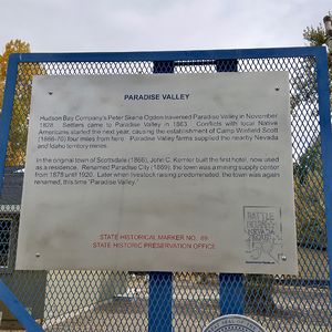 Established 12 Dec 1866 by Captain Murray Davis and Company A, 8th U.S. Cavalry. The camp was built of adobe, rock, and lumber along Cottonwood Creek at the north end of Paradise Valley, Nevada. Established to control hostile Indians who were attacking settlers and miners.