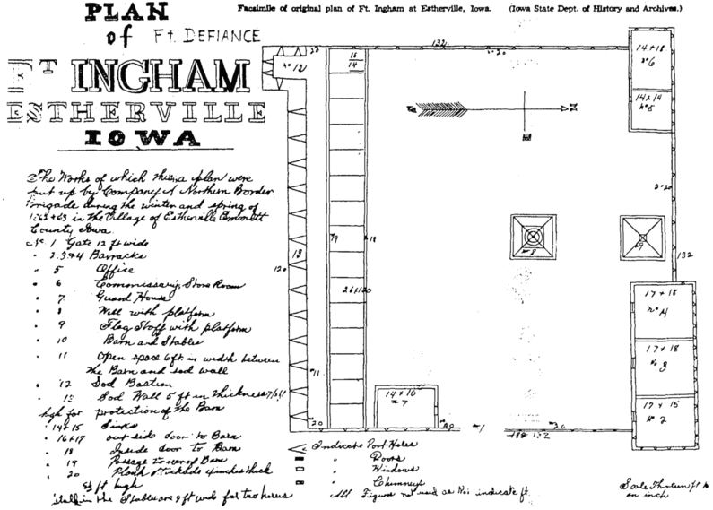 HistoryFort Defiance was located on the west fork of the Des Moines River at Estherville in Emmet County. Iowa. This fort and five others were established in Iowa as a result of the 1862 Sioux Indian uprising and the slaughter of some 800 settlers by raiding Sioux warriors in August 1862. This line of forts provided large stockades to hold local settlers during times of Indian alarm. Each of the forts was manned by a detachment of troops of the Northern Iowa Border Brigade (militia), who were organized by the Iowa governor to deal with the crisis. Captain William Ingham was commissioned as Commander of Company A, about 30 men, who were posted to Estherville to build Fort Defiance. The Fort Defiance stockade enclosed an area 120' by 132' with a thick sod wall on the south side protecting the huge barn/stable and a thick plank stockade on the other three sides. A 12' wide gate provided access on the east side. On the north side were the three barracks, the office, and the commissary. The flagstaff was centered at the back of the north wall and a well was located near the center of the stockade. The 120' by 132' barn/stable occupied the whole south wall with room for 54 horses and a privy. A guardhouse was later built but never used. Construction of the fort was completed in June 1863 some 8 months after the uprising had been put down. The full brigade was mustered out of service in late December 1863 and replaced with elements of the 6th U.S. Iowa Volunteer Cavalry during the spring of 1864. With their departure, the fort was abandoned. Current StatusA barracks has been reconstructed within Fort Defiance State Park as a public use building. The original site at South 6th St. and 1st Ave South has a plaque on the Fort Defiance Professional Building. A 1911 D.A.R. monument is located in front of the Emmet County courthouse.