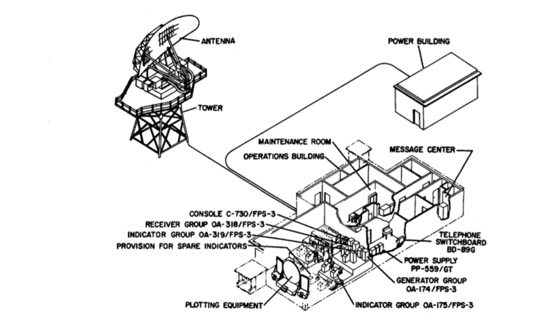 FPS-3 Long Range Search Radar Set - A long range search radar manufactured by the Bendix Radio Division of Bendix Aviation Corporation and deployed to long range radar sites in the 1950s. Equipped with Moving Target Indicator (MTI) and normally employed as part of an aircraft early warning network. Capable of detecting heavy bomber aircraft at a range of 200 to 300 miles and a height of approximately 40,000 to 60,000 feet depending on the range. Operates in temperatures ranging from -67 deg F to plus 140 deg F with humidity up to 100 percent and at altitudes from sea level to 7,000 feet. Variants include the FPS-3A, the FPS-508 Canadian version and the MPS-7 Mobile Version.
