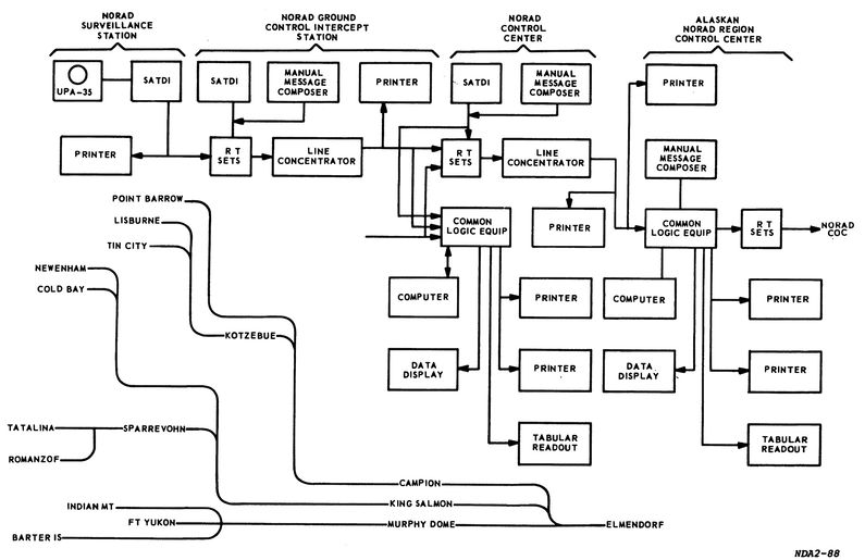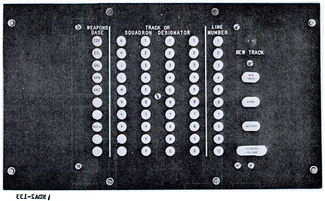 The FYQ-9 SystemThe FYQ-9 System was envisioned with several goals in mind. These included replacing the slow and labor-intensive process of manually plotting radar tracks and manually "Telling" the tracks up the chain of command. Decision-making was required at each level to ensure that only the important tracks reached the NORAD Combat Operations Center in Colorado and that the appropriate action was taken at each intermediate level. Automating the "Telling" function greatly sped up the process and required significantly fewer operations personnel at the remote radar sites. The system placed the highly capable UPA-35 PPI scopes at each of the radar sites with a modified front shelf to provide a track identity and input capability using a trackball, a keyboard, and an entry button. The UPA-35 shelf was known as the Semiautomatic Track Data Inserter (SATDI) and contained 20 track selection buttons. Once entered, tracks were automatically forwarded using M-28 teletype gear to all echelons. The M-28 teletype gear was configured to provide a limited store-and-forward buffer to concentrate traffic during heavy traffic periods. GCI Radar sites had the additional capability to manually input track messages regarding weapon status etc using a Manual Message Composer (MMC). M-28 teletype printers were used to provide hardcopy throughout the system. At the four radar sites that were also command centers and at the Regional Combat Center a UYK-1 Computer accomplished the necessary coordinate conversions to place each track at the correct geographic location on vertical plotting displays. The UYK-1 Computer was particularly suited for this type of application having been designed for use aboard nuclear submarines. Its rounded shape was designed so that it would fit down a submarine hatch.