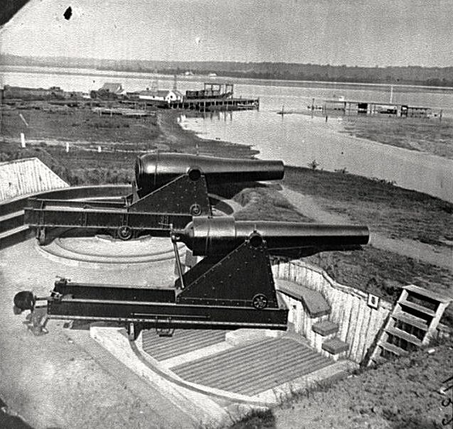 Battery Rodgers 15" Rodman Gun in Background, 8" Parrott Gun in Foreground, public domain This image is available from the United States Library of Congress, Prints and Photographs Division under the digital ID 4a39646r. No known copyright restrictions.