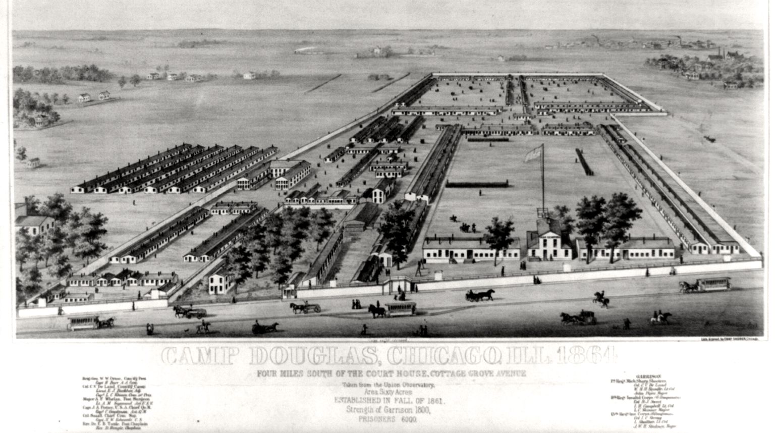 Camp Douglas from Union Observatory in 1864, public domain This image is available from the United States Library of Congress, Prints and Photographs Division under the digital ID 3a17854u. No known copyright restrictions.