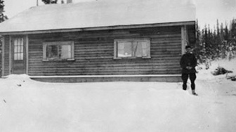 Fort Reliance Detachment Building winter 1927, person is either Cpl. Williams or Constable Hooper, public domain Canada Archives