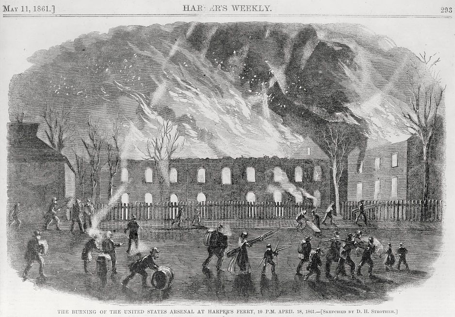 Harpers Ferry Arsenal Burning, public domain This image is available from the United States Library of Congress, Prints and Photographs Division under the digital ID 3c34477v. No known copyright restrictions.