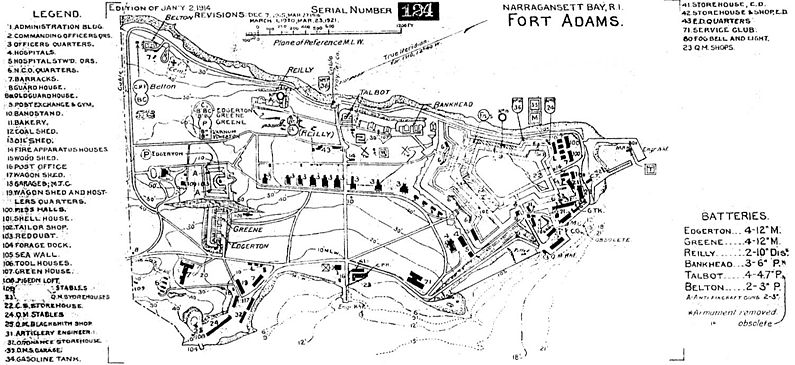Construction on the first of six concrete Endicott Period gun batteries on Fort Adams began in 1896. The first two were 12" mortar batteries, Battery Greene and Battery Edgerton and they were both accepted for service in May 1898 during the Spanish-American War. Battery Reilly (10") and Battery Talbot (4.72") followed in 1899. Battery Bankhead (2) (6") and Battery Belton (3") were accepted for service on the same day, 31 Jul 1907. All of the guns in these batteries were breech loaded and rifled. None of the batteries was located within the walls of the old Fort Adams and most were aligned along the water on the west side of the post. Only the mortar batteries were set back from the water's edge.