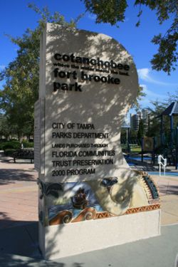 HistoryEstablished after the Treaty of Camp Moultrie that established a Seminole Indian Reservation in 1823. Fort Brooke was a major Florida post during the Second Seminole War (1835-1842) and served as an embarkation point for the removal of the Seminoles to the Indian Territory. Maj. Francis Dade and his entire command of over 100 men were massacred in 1835 as they traveled from Fort Brooke to Fort King. In 1841 the fort had as many as 680 men assigned. After the end of the Second Seminole War in 1842, the fort continued to be garrisoned until 1860. During the U.S. Civil War Fort Brooke was occupied by Confederate forces (1863-1864) and recaptured by Union forces in 1864. After the end of the war, the post was used as a seasonal camp for troops from Key West Barracks until abandoned in 1882. The post was formally abandoned about 21 Dec 1882 at the direction of the Department of the South, S.O. 120 dated 13 Dec 1882. During the Spanish American War (1898) Army troops camped here while awaiting embarkation for transport to Cuba. Current StatusFort Brooke City Park is located at the approximate site of old Fort Brooke. The park contains several markers detailing the history and events surrounding Fort Brooke. Two 24 pounder cannons reportedly from Fort Brooke are mounted on replica carriages. The cannons are located at Plant Park on the University of Tampa Campus.