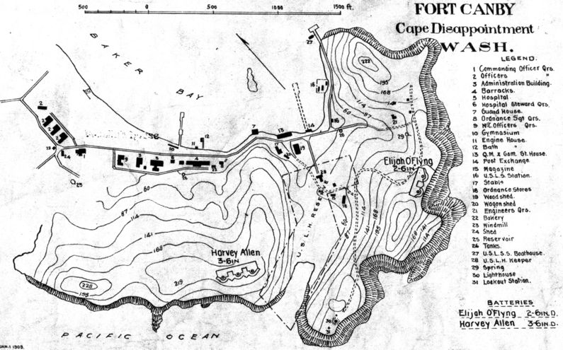 U.S. Civil War (1861-1865)In 1852 the War Department created a military reservation at Cape Disappointment to protect the mouth of the Columbia, but construction did not begin until August 1863. The post was completed and occupied by troops 15 Apr 1864. Several frame garrison buildings were erected and a fortification consisting of three earthwork batteries armed with smoothbore cannons was built to protect the mouth of the Columbia River. Engineer George H. Elliot was charged with building the three batteries which were known as "Lighthouse Battery", "Left Battery" and "Center Battery". The Lighthouse Battery had a total of seven guns, two 8", four 10" and one huge 15" Rodman smoothbore mounted on a center pintle in front of the lighthouse. All three batteries were to meant house a total of 22 guns. An 1870 report indicated that the post had a single two-story barracks, 80 by 30 feet and 28 foot high, three small frame officers' quarters, a guard house and a small eight-bed hospital. The guard house is described as built on pilings over the water and as having fourteen cells, four dark. The fort is said to be the site where, on 15 Nov 1805, members of the Lewis and Clark Corps of Discovery first stepped into the breaking surf of the Pacific Ocean. Endicott Period (1890-1910)Part of the Harbor Defense of the Columbia. Two other forts, Fort Stevens on the Oregon side and Fort Columbia on the Washington side of the Columbia River completed the Harbor Defense System. Between 1896 and 1908, after a long period of neglect during which the fort and its armament had become obsolete, the Army completely renovated them. New barracks and other buildings were constructed, and two batteries (Battery Harvey Allen and Battery O'Flyng) with a total of five rifled guns in concrete emplacements were installed.