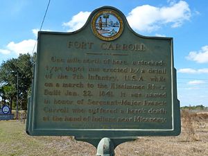 Fort Carroll (2) (1841-1841) - A U.S. Army post established in 1841 during the Second Seminole War by Captain T.P. Guynn, 8th U.S. Infantry, in present day Polk County, Florida. Named for Sergeant Major Francis Carroll, 7th U.S. Infantry, who was killed by hostile Indians while escorting the wife of an officer from Micanopy to Waccahoota. Abandoned in 1841 in favor of Fort Cummings. HistoryA U.S. Army post established 22 Jan 1841 by Captain T.P. Guynn and elements of the 8th U.S. Infantry. Abandoned for health reasons later in 1841 with the troops removed to Fort Cummings. Current StatusPrivate property in Polk County, Florida.