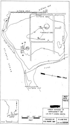 Fort Church (1939-1947) - A World War II Coastal Fort first established as Sakonnet Point Military Reservation in 1939 on Sakonnet Point, in Little Compton, Newport County, Rhode Island. Named Fort Church in General Order #5, 1 May 1940 after Colonel Benjamin Church, a colonial citizen soldier. The Army discontinued use in 1947. World War IIPart of the Harbor Defense of Narragansett Bay. Acquired in 1939-1942 by condemnation and purchase as three separate parcels of land known as Fort Church (East), Fort Church (West) and Fort Church (South). First known as Sakonnet Point Military Reservation and then officially named as Fort Church in 1940. One 16", 100 series gun battery, one 8" casemated battery and one 6" 200 series gun battery were planned, one on each parcel of land. An unnamed 155mm battery was removed in 1943 to clear the field of fire for Battery 212.