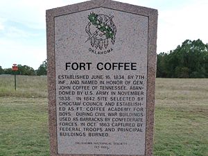 Fort Coffee (1834-1838, 1861-1863) - A U.S. Army post established in 1834 in Le Flore County, Oklahoma. Named after Brigadier General John Coffee, 7th U.S. Infantry, war of 1812 commander, who died 7 Jul 1833. Abandoned in 1838. The post was occupied again by Confederates during the U.S. Civil War, captured by Union forces and burned down, finally abandoned in 1863. HistoryA U.S. Army post established on 16 Jun 1834 by the 7th U.S. Infantry at Swallow Rock (also called Herrold's Bluff) on the south bank of the Arkansas River in Le Flore County, Oklahoma. The post was established to curb the shipment of whisky up the river into the Indian Territory with troops from the nearby abandoned first Fort Smith (2) in Arkansas. The U.S. Army abandoned the post on 19 Oct 1838 after the second Fort Smith (2) was established nearby. The abandoned post was selected as the Fort Coffee Academy for Boys by the Choctaw Indian Council in 1842 and operated by Methodist missionaries. The school was discontinued as the U.S. Civil War began and occupied in 1862 by Confederate forces and recaptured by Union forces in October 1863. The Union forces burned the primary buildings and finally abandoned the post later in 1863. Current StatusThe post location is on private Property in Le Flore County, Oklahoma. The bluff that the post was built upon has been quarried by the U.S. Corps of Engineers for the nearby dam and locks. The marker that was located on a rural road near the original fort site has been redone at a location on the more travelled Highway 9/271 south of the original post location.