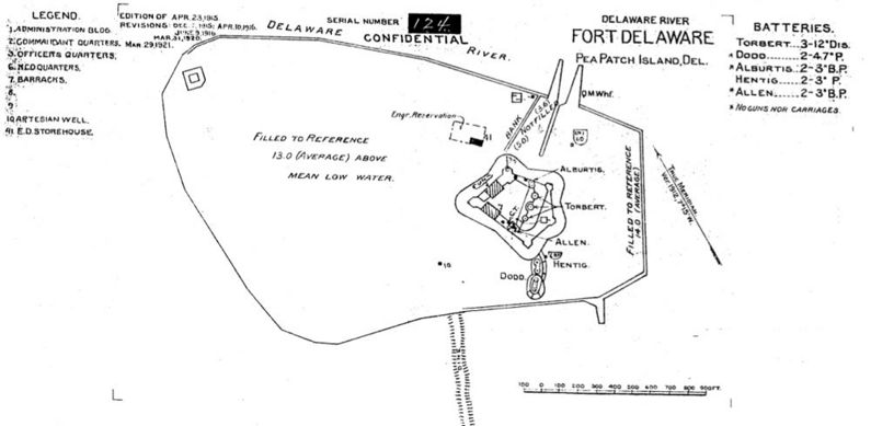 Endicott PeriodIn the late 1890s, coastal defenses were again updated and Fort Delaware had five Endicott Period gun batteries built, the largest being Battery Torbert with 3 - 12" disappearing carriage guns. Three of the larger caliber batteries were built into the casemates of the old fort and two of the smaller caliber batteries were built outside the moat of the old fort. Three Endicott Period batteries (Battery Dodd, Battery Alburtis, Battery Allen) had their guns removed and shipped away during or just after World War I.
