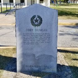 Fort Duncan (1849-1912) - Established 27 Mar 1849 by Captain Sidney Burbank (Cullum 557) and companies A, B and F of the 1st U.S. Infantry, fresh from their founding of Fort Inge on the Leona River near present Uvalde. The fort was named after Colonel James Duncan (Cullum 755), a hero of the Mexican War who died in the same year 1849. It was one of a line of five frontier military outposts. The Fort was abandoned in 1912. Also known as Camp Eagle Pass, Camp at Eagle Pass, Camp Near Eagle Pass and Camp on the Rio Grande. The Early YearsThe first buildings erected at Fort Duncan were the Commissary Store House and the Hospital, and then the Commanding officer's quarters, which was the last house at the western end of the officer's line. Eventually, the post consisted of a storehouse, two magazines, four officers' quarters, and a stone hospital, in addition to quarters for enlisted men. The fort was significant because of the trade crossing into Mexico at Eagle Pass, its location on the California Road, and its position for scouting against Indians in the 1850s. Roads ran to Fort Inge and Fort McIntosh (1) and mail was received from San Antonio.