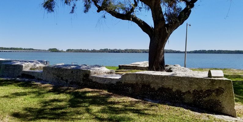 The riverside of the original fort is gone and the remains are under the Beaufort River. The walls of the other three sides are the only visible remains of the fort. The walls are approximately 5' 8" thick and 3-4' high. Listed in the National Register December 31, 1974.