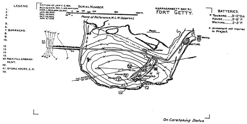 Fort Getty (1900-1948) - An Endicott Period Coastal Fort first established in 1900 on Conanicut Island, Jamestown, Rhode Island on the site of previous fortifications. Named in G.O. 78, 25 May 1903 after Colonel George W. Getty, 4th U.S. Artillery, (Bvt Major General, U.S. Volunteers), who died 1 Oct 1901, at Forest Glen, Maryland. Abandoned in 1948. Endicott PeriodPart of the Harbor Defense of Narragansett Bay. Battery construction began in 1901 and continued through 1905. All three of the batteries were accepted for service on the same day, 7 Jun 1910. Post construction was very limited with only one 10 man barracks and one storehouse constructed. The 10 man barracks doubled as the caretakers quarters during the years the post was in caretaker status. The garrison was first established 16 Jul 1909.
