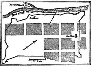 Fort Greene Ville (1793-1796) - Established in 1793 by General "Mad" Anthony Wayne during the Northwest Territory Indian War. Named after General Nathanael Greene Abandoned in 1796. Northwest Territory Indian WarGeneral "Mad" Anthony Wayne ordered the construction of Fort Greene Ville in 1793 during the Northwest Territory Indian War. The post was laid out much like a small city with a block like plan and was one of the largest wooden fortification ever built. The rectangular stockade enclosed 55 acres with walls 1,800' long, 900' wide and 10' high. The post could support the four sub Legions of General Wayne's Legion. A double row of cabins, each housing 10 men, ran around the inside of the exterior walls. Each corner had a bastion and blockhouses were built into the central wall of each side. Eight redoubts, each complete with a blockhouse, surrounded the main stockade. The Treaty of Greene Ville was signed on 3 Aug 1795 at Fort Greene Ville, ending the war. The fort was abandoned the next year and settlers descended on it stripping it of construction materials and finally burning it down to scavenge metal hardware.
