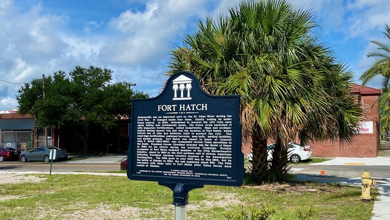 HistoryJacksonville, Florida changed hands four times during the U.S. Civil War, finally ending up under Union control in March 1864 after the Battle of Olustee. The Union Army then encircled Jacksonville with fortifications, including a number of forts, extensive earthworks, and nine gun batteries all built to prevent another Confederate capture of the city. The fortifications included barracks, mess halls, medical facilities, and even parade grounds. With no enemy to fight, the Union forces in Jacksonville were soon requisitioned by Union commanders up north. The city was evacuated by the Union forces by 26 July 1864. Current StatusA roadside marker is located at Adams Street and Davis Street. Previously the location of the fort could not be confirmed but archeologists have determined the location using maps and archaeological testing. The roadside marker is at the location of Fort Hatch.