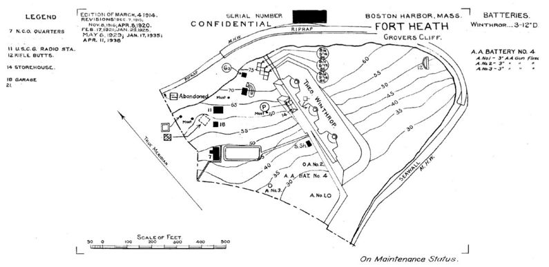 Fort Heath (1895-1965) - An Endicott Period Coastal Fort first established as Grover's Cliff Military Reservation (1895-1899) in 1895 near Winthrop, Suffolk County, Massachusetts. Named Fort Heath in G.O. 43, 4 Apr 1900, after William Heath, a delegate from Massachusetts to the Federal Constitutional Convention, who served faithfully and honorably as a Major General in the Continental Army during the Revolutionary War. Abandoned in 1965. Endicott Period (1890-1910)Part of the Harbor Defense of Boston, Massachusetts. Battery Winthrop with three 12" guns was accepted for service at Fort Heath on 4 Oct 1901. Only one permanent building was built at Fort Heath, a 12 man detachment barracks in 1901. The post was garrisoned by detachment from Fort Banks (2).