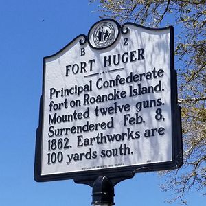 Established in 1861 by Confederate forces as one of three earthworks forts for the defense of Roanoke Island and the adjacent mainland. Fort Huger was the largest of the three, located on Weir Point, with twelve guns pointed to the Croatan Sound. On the opposite side of the sound was a single fort, Fort Forrest, with a seven-gun battery, located on Redstone Point.