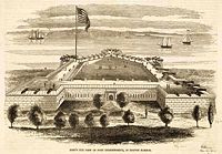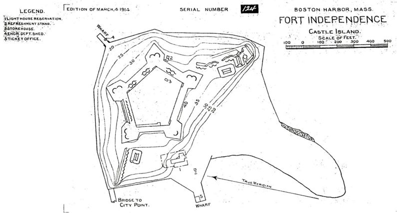 Fort Independence (1) (1801-1960) - Fort Independence began as a First System fort built in 1801 on the rubble of previous forts, and in particular that of Castle William, a Revolutionary War post home to the Massachusetts State Guard. Located on Castle Island, Suffolk County, Massachusetts. Initially abandoned 25 Nov 1879 it was regarrisoned briefly during the Spanish American War and saw service in World War I and World War II. Finally declared surplus in 1960. First System (1794-1808)Established on Castle Island in Boston Harbor to protect the main ship channel into Boston. Construction of the star shaped fort began in 1800 and was almost complete in 1803. Planned to mount 42 guns with two outer batteries each mounting six guns.
