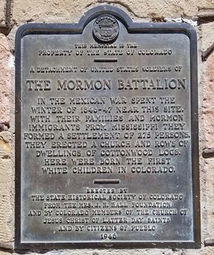 HistoryA detachment of the Mormon Battalion arrived at Fort Pueblo in the fall of 1846 with their families and Mormon immigrants from Mississippi. They established a log settlement south of Fort Pueblo that served as a winter camp for the detachment and all of the accompanying civilians. The settlement became known as Fort Independence or the Mormon Colony Winter Camp. The Mormons erected a street of cabins built of cottonwood logs, laid one above the other and chocked with mud to make the structures weatherproof. A large log Mormon temple was built at one end. It was said that some 275 people wintered at the post during the winter of 1846-1847. The fort was abandoned in the spring of 1847 and on 27 Jun 1847, the Mormon immigrants reached their destination at Salt Lake City. Current StatusOnly a monument remains, erected in 1946 to a detachment of U.S. Soldiers of the Mormon Battalion who wintered here with their families and Mormon immigrants from Mississippi near the site of the monument.