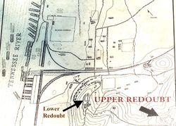 Lower RedoubtThe original Redoubt was situated on a ridge directly behind and above the supply depot warehouses. Elements of the 12th and 13th U.S. Colored Troops under Colonel John A. Hottenstein and contraband labor constructed the Lower Redoubt between May and the first week of November 1864 after completion of the Nashville and Northwestern Railroad from Kingston Springs in Cheatham County to Johnsonville. When completed this redoubt and its surrounding rifle pits were manned by both black and white infantry and artillery units. The Lower Redoubt was an irregularly shaped work with one bastion. It measured approximately 210 feet by 100 feet. These earthworks were built five to six feet high and reinforced with stones or logs. Interior ditches allowed soldiers to stand and be protected by the earthen walls while outer ditches made scaling the earthwork more difficult. Ten field guns were positioned near the lower redoubt and several can be seen on the far right of the photo above. The weaknesses of this particular redoubt included too low an elevation and a flawed orientation that did not allow complete coverage of approaches to the depot.