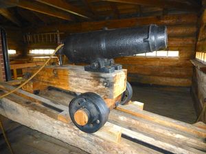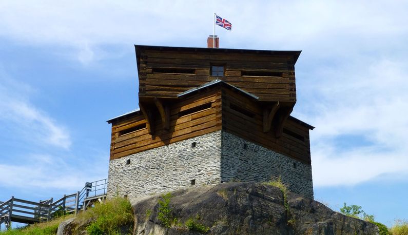 Fort Madawaska (1841-1847) - A British colonial militia post established in 1841 during the Aroostook War in present day Edmundston, Madawaska County, New Brunswick, Canada. Abandoned in 1847 and hit by lightning and burned down in 1855. Also known as Petit Sault Blockhouse and Fort Petit Sault. HistoryEstablished during the Aroostook War in 1841 on a hilltop overlooking the strategic confluence of the Madawaska River and Saint John River at present day Edmundston. The post consisted of a stockaded blockhouse with room for a garrison of one officer and 50 men. The blockhouse was a three story structure with the first floor built of stone and the upper two floors of squared timbers. The top floor was placed at an angle to the lower two floors and equipped with defensive down facing gun ports. The top floor also had ports for four cannons. The Aroostook War ended in 1842 with the signing of the Webster-Ashburton Treaty settling the boundary dispute between America and British Canada. The blockhouse was hit by lightning in 1855 and burned down. Current StatusReplica Blockhouse constructed on the original site in 2001, Edmundston, Madawaska County, New Brunswick, Canada. The replica blockhouse houses a museum, artifacts and displays from the period. On the top floor is a period mounted cannon.