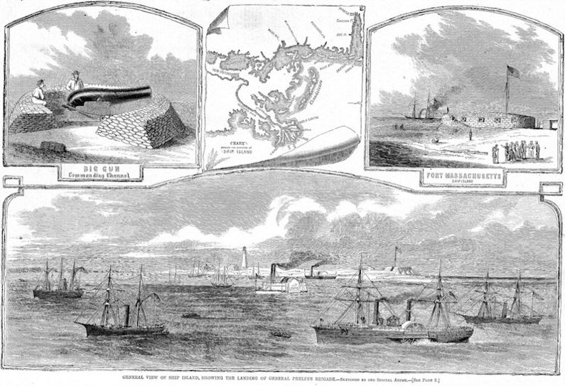 Fort Massachusetts (1) (1859-1875) - Construction began in 1859 as an unnamed Third System brick fort and was incomplete when the U.S. Civil War began. The fort was located on Ship Island in present day Harrison County, Mississippi. Taken over by Confederate troops 20 Jan 1861 and named Fort Twiggs for Confederate Major General David E. Twiggs. In September 1861 Union troops reoccupied the fort. The last military units left the fort in 1875. The Fort was not referred to as Fort Massachusetts in official correspondance until 27 Jun 1884 and that name was never officially given by a War Department General Order. Also known as Fort on Ship Island and Fort at Ship Island. HistoryConstruction began in March 1859 on the brick "D" shaped Third System fort and slowly progressed until the beginning of the U.S. Civil War. The progress of the fort is displayed in the color of the brick in the walls. "Grey" brick from Louisiana was used before the war and rises some 3 feet along the curved wall. "Red" brick from Maine was used during the war and rises to the top of the casemates. The brickwork on the Barbette tier resumed the use of Louisiana "Grey" brick after the war. The U.S. Corps of Engineers completed the fort in 1866. The completed fort contained a single layer of casemates and a barbette tier. Three circular staircases connected the parade level to the barbette tier. Four magazines on the Barbette tier serviced the Barbette guns. Two magazines on the parade level serviced the casemate guns. A hot Shot furnace was placed on the parade. Two half bastions flanked the single sallyport with guardrooms on either side. The Fort was designed for 37 cannons but only 17 were mounted, thirteen 10-inch Rodman Cannons in the casemates, two 15-inch Rodman cannons in the demi-bastions and two 100-pounder rifled Parrott guns over the sallyport. All of these were mounted in 1866 after the U.S. Civil War. After the recapture of Fort Massachusetts by Union forces in September 1861, Ship Island was used as a springboard for the Union capture of New Orleans in 1862. Union ships used the island for repairs and to pick up supplies. Almost 40 buildings were constructed on the island during the war including a hospital, barracks, a mess hall, and a bakery. As many as 18,000 Union troops were stationed on Ship Island during the war and it housed as many as 4,430 Confederate prisoners of war during 1864 and 1865. Upon completion, the fort was turned over to civilian fort keeper C. H. "Pop" Stone who was to maintain the fort in a state of readiness. When cannons were mounted, an ordnance-sergeant was assigned to care for the fort's armament and he eventually assumed all responsibility for the upkeep of the fort. The last ordnance-sergeant was relieved of duty in 1903, and the Ship Island lighthouse keeper became the fort's caretaker.