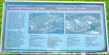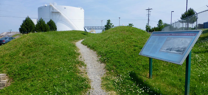 Current StatusThe Canadian Forces Reserves still maintain a presence here at the Sydney Garrison - Victoria Park, renamed Fort Ogilvie in 1999. Battery point now contains an Esso petrolium storage facility, a waste treatment plant, a six block military compound with three large buildings, a parking lot and a large drill/training field. Just outside the fence at the northwest corner of the military compound is a re-creation of one of the original battery earthworks and several reader boards explaining the two batteries and the current (as of 1999) military compound. The re-creation is simply earthworks with no display guns or even emplacements represented. Because the street names have not changed appreciably, the earth works look like they are at the correct location of the original left side battery. Victoria Park is described on the reader boards as being the "...oldest continuing military establishment in Canada." Operating continuously since 1785, and was still in operation as of 7 Jul 2013, the date of our visit.