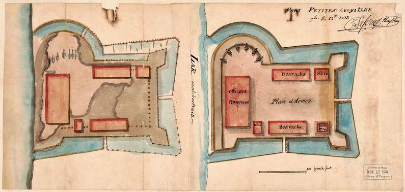 Fort Petite Coquilles (1) (1813-1827) - A War of 1812 Second System Fort established in 1813 near New Orleans, Orleans Parish, Louisiana. Named Fort Petite Coquilles after the island of Petite Coquilles, or “Little Shells.” Abandoned in 1827. Replaced by Fort Pike (1). HistoryErected by the United States Government on the east end of Lake Pontchartrain. General James Wilkinson ordered the construction of Fort Petite Coquilles, planned and superintended by New Orleans engineer Bartholemy Lafon. The fort was built as a parallelogram with two full bastions at the east end, a half-bastion at the southwest corner, and a semicircular battery extending beyond the north rampart on the lakeside. Lafon’s plan shows it approximately 250 feet wide by 310 feet long and surrounded by a wet moat. The completed fort contained two troops barracks, an officers' quarters, a magazine, a store, and a kitchen. In June 1816 the fort reported eleven guns mounted of different calibers. The construction of Fort Petite Coquilles turned out to be a major factor in defeating the British plan to capture New Orleans by blocking a narrow pass into Lake Pontchartrain and forcing the British to their defeat at Chalmette on 8 Jan 1815. The War Department's Fortification Board in 1817 selected a replacement fort site just three-quarters of a mile east of Fort Petite Coquilles. Construction on the replacement fort began in 1819. The last post return for Fort Petite Coquilles was in November 1827. A hospital was constructed in the interior of the ruins of Fort Petite Coquilles in the 1840s. The site consisted of the hospital building, a kitchen, and doctor’s quarters. A shell road connected Fort Pike (1) with the hospital. In 1867, a new hospital with two wings was built on the site. In 1894 the City of New Orleans used the hospital as a quarantine hospital. About 1900 the site of old Fort Petite Coquilles and the hospital sank into the waters of Lake Pontchartrain. Current StatusThe site of the fort is underwater less than a mile west of Fort Pike State Park.