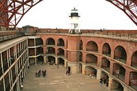 Fort Point (3) (1853-1914) - Originally a Third System brick Fort established under the supervision of 1st Lt. William H.C. Whiting (Cullum 1231), U.S. Corps of Engineers, and under construction 1853 to 1861. Renamed Fort Winfield Scott after Major General Winfield Scott, 25 Nov 1882. The old fort was declared obsolete in 1905 and abandoned for military purposes in 1914. Also known as Fort Scott (1), Fort Blanco, Castillo de San Joaquin and Old Fort Scott. Early HistoryThe first fortification at the Punta del Cantil Blanco was the Spanish Fort Blanco, completed 8 Dec 1794. This was a horseshoe shaped fort that mounted eight bronze cannons cast in Lima, Peru. Four of these cannons still exist on the Presidio of San Francisco and two on Fort Mason (2). In 1853, the army razed the old fortification and cut away a solid foundation out of the base of the cliff and began work on Fort Point. Colonel Joseph K.F. Mansfield inspected Fort Point on 4th and 5th of May 1854, and found construction supervised by Brevet Major John G. Barnard (Cullum 708). He noted that the design was not yet complete and that he thought the fort should mount at least 200 guns. Fort Point was a Third System brick fort completed in 1861 and initially garrisoned by two companies of the 3rd U.S. Artillery. It was originally built to prevent entrance of a hostile fleet into San Francisco Bay and was designed to mount 126 large cannon. It was the only Third System brick fort built on the west coast of the United States.