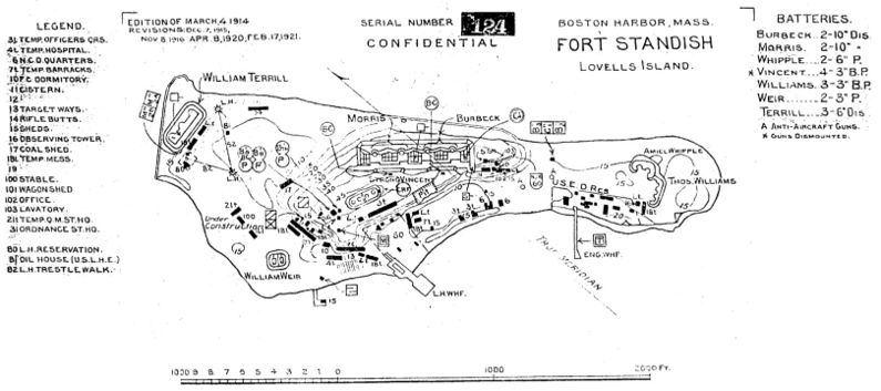 Fort Standish (1) (1900-1947) - An Endicott Period Coastal Fort first established in 1900 on Lovell's Island in Plymouth County, Massachusetts. Named Fort Standish in G.O. 43, 4 Apr 1900, after Myles Standish, a famous soldier who joined the expedition sailing on the "Mayflower" and gained distinction in the defense of the Plymouth Colony and in the direction of operations against hostile Indians, (1620-1656). Post declared surplus in 1947. Endicott PeriodPart of the Harbor Defense of Boston, Massachusetts. Seven Endicott Period gun batteries were built on Lovell's Island Island between 1899 and 1907 and accepted for service. By 1909 the batteries were completed and quarters built for 4 NCOs. One of those quarters was a caretaker/NCO quarters. In 1909 the post was garrisoned by detachment from Fort Warren (2). The guns for Battery Burbeck and Battery Morris (2) were on hand but not mounted and the guns for Battery Williams were not on hand.