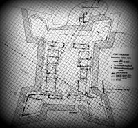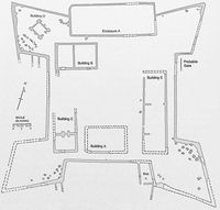 The excavation plan after 1973-1974 seasons. From Chartrand, René, The Forts of New France, the Great Lakes, the Plains and the Gulf Coast, 1600-1763, page 54.