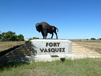 These four posts were located roughly midway between Bents Old Fort on the Arkansas River and Fort William (1834-1845) at the junction of the Laramie River and the North Platte River (later known as Fort Laramie). In 1840 Fort Vasquez shipped 700 buffalo robes to St. Louis compared to the 15,000 that the Bent, St. Vrain & Company shipped. The fort was sold for $800 in 1840 to two traders who subsequently abandoned the post in 1842 without paying Vasquez and Sublette. Current StatusPart of the Colorado Historical Society museum system, Weld County, Colorado. Includes a museum, a WPA reproduction of the old fort and a monumental bronze statue of a bison. The fort reproduction has a walled outline of the fort's exterior walls but no interior details.