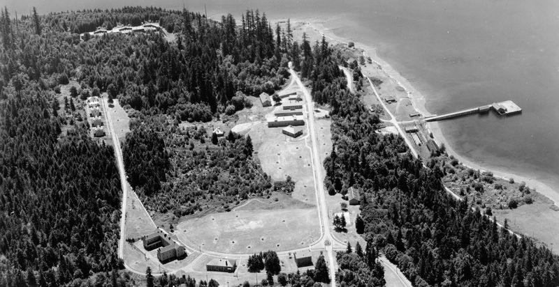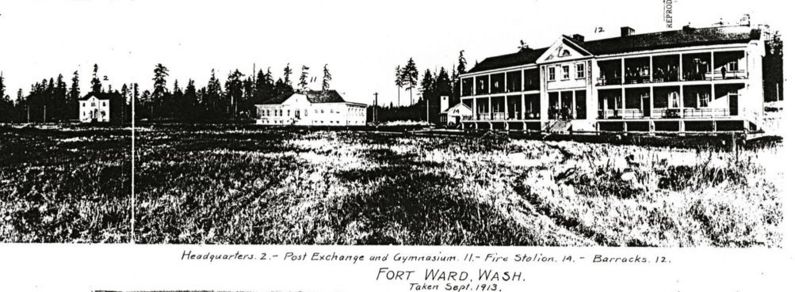 Fort Ward Panorama 1913. L-R Admin Building #2, Post Exchange & Gym #11, Firehouse #14, CAC Barracks #12.