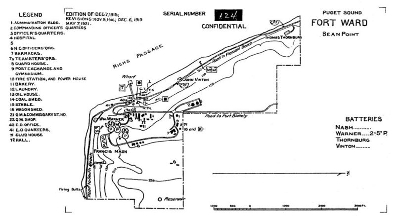 Fort Ward (2) (1901-1938, 1942-1958) - Construction began 1 Feb 1900, completed in 1901 on Bainbridge Island, Kitsap County, Washington, Named Fort Ward in G.O. 84, 12 Jun 1903, after Colonel George H. Ward, 15th Massachusetts Volunteer Infantry, Bvt. Brigadier General, U. S. Volunteers, who died, 2 Jul 1863, of wounds, received at the battle of Gettysburg, Pennsylvania, during the U.S. Civil War. Abandoned as a coastal defense in 1928 and turned over to U.S. Navy in 1938. Decommissioned by the Navy in 1958.