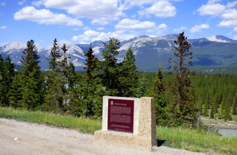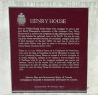 Henry House (1811-1814, 1820s-1830s) - A North West Company post established by William Henry in 1811 on the Athabasca River near present day Jasper, Alberta, Canada. Named after the builder William Henry. Abandoned in the 1830s. History of Henry HouseA North West Company post originally built by William Henry in 1811 to suport David Thompson's expedition to the Athabasca Pass. This small post was built at the head of navigation on Athabasca River on the eastern side of the Athabasca Pass. The Athabasca Pass provided a crossing point through the Rocky Mountains to western Canada and for a time was the principle highway from the plains to the Pacific coast for the fur trade. The post was occupied sporadically and abandoned in the 1830s. Current StatusMarker only alongside Hwy 16 in Jasper, Alberta. Actual site is unknown.