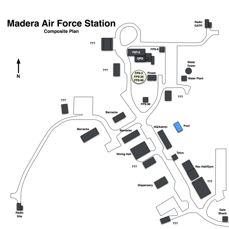 The site began operation as a SAGE site in 1960 initially feeding the Beale SAGE Direction Center DC-18. By 1963 the FPS-20 had been upgraded to an FPS-66 and was operating with one FPS-6 and one FPS-90 height-finder. When the Beale SAGE Direction Center DC-18 closed, control was transferred to Norton SAGE Direction Center DC-17 on 1 Aug 1963. The Norton SAGE Direction Center DC-17 then closed in 1966 and control was shifted to Luke SAGE Direction Center DC-21 on 1 Apr 1966. The site closed less than three months later. ClosureThe official announcement of the closure of Madera AFS came on 19 Nov 1964 from Secretary of Defense Robert S. McNamara at the Pentagon. Originally slated to close in July 1967, the deactivation was accelerated to align with the reconfiguration of the SAGE System in April 1966. Madera AFS and the 774th were deactivated on 1 Apr 1966. The site was transferred to the Bureau of Indian Affairs (BIA) on 3 Apr 1967 for use as a vocational training center. The site later transitioned into private hands. Physical PlantThe land for this site was originally leased farmland in Madera County, California. The land was later acquired by the U.S. Government through direct purchase and by condemnation. The site was unusual for radar sites because it was located on flat farmland at a low elevation, 325 feet. The physical plant of the site was divided into the main site, a cantonment area, a housing area and a radio site.