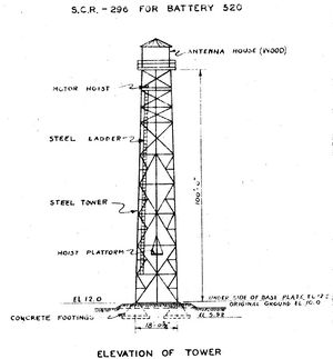 Constructed completed and transferred for use at Marshall MR on 18 May 1944. Construction costs to date of transfer were $ 11,250. The physical plant consisted of a transmitter building, two powerhouses each with a 1000 gallon fuel tank, a 100' steel tower and an antenna housing disguised as a Water tank atop the tower. The three buildings and the tower were prefabricated steel units furnished by the Signal Corps. The buildings and the tower were placed on concrete pads and footings installed by the Corps of Engineers who erected all of the structures. Access to the antenna on top of the tower was by a steel ladder and a small hoist operated by an electric motor.