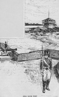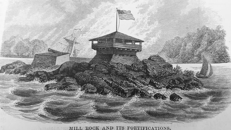 Mill Rock Fort (1812-1815) - A War of 1812 fortification established in 1812 on Mill Rock Island in present day New York County, New York. Abandoned as a fortification at the end of the war in 1815. History of Mill Rock FortEstablished in 1812 as a coastal defense in the East River of New York City. Built to defend the East River channels with a gun battery and a large supporting blockhouse. This fortification was one of a line running diagonally across the northern end of Manhattan Island from Fort Laight in the north to the Halletts Point Tower in the south. Included in the line from north to south were Fort Laight, NYC Blockhouse No. 3, NYC Blockhouse No. 2, NYC Blockhouse No. 1, Fort Fish, Fort Clinton (4), Mill Rock Fort, Fort Stevens (5) and the Halletts Point Tower. These fortifications were located on line of bluffs in the north that overlooked the landside approaches and the major roads into New York City. The southern end of the line guarded McGowans Pass along the Old Post Road and the back door water approach to New York City via a treacherous stretch of water known as Hell Gate. In addition to these major fortifications, a number of gun batteries and smaller redoubts were located at strategic points to reinforce and protect specific areas. Often these fortifications were connected by earth works and trenches. Abandoned as a fortification at the end of the war in 1815. Burned down in 1821.