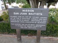Mission San Juan Bautista (1797-1835) - A Spanish mission established in 1797 by Father Fermin Lasuen in present day San Juan Bautista, San Benito County, California. Associated with the Presidio of Monterey Named for Saint John the Baptist. Secularized in 1835. The Spanish Period (1769-1821)The Spanish period began in California with the building of Mission San Diego de Alcala, and the Presidio of San Diego in 1769. The Spanish Presidio provided a support system for the attached missions that included military troops. The mission provided provided a complete community for the converted native peoples that included agriculture and industry activities as well as religious instruction and services. Typically a very limited military presence was maintained at the missions and the presidio acted as the garrison for the surrounding missions. The Mission San Juan Bautista was founded on 24 Jun 1797, by Father Fermin Lasuen, as the 15th of twenty-one Spanish missions founded in California. Mexican Period (1822-1846)The Mexican period began with the end of the Mexican Revolution around 1820. Mexican troops occupied the presidios and Mexican governors ran the province of Alta California. The Mexican government began the process of secularization (turning church lands over to private interests) around 1831 and passed laws in 1833 mandating secularization of all missions in Mexico. Secularization gradually ended church ownership of community property. Most of the missions and presidios were abandoned and fell into disrepair as the lands were redistributed to private owners. The American Period (1846-Present)The Mexican War was declared by the U.S. Congress on 11 May 1846 in response to a Mexican attack on U.S. troops in Texas. The declaration of war opened the door for American occupation of California. The American period began when American forces occupied San Diego in 1846. With end of the war, Mexico ceded all of upper California to the Americans in 1848 and a new round of land redistribution began. On 19 Feb 1853, Archbishop Joseph Sadoc Alemany filed a claim on behalf of the Roman Catholic Church for the return of all former mission lands in the State of California. Ownership of 1,051 acres (for all practical intents being the exact area of land occupied by the original mission buildings, cemeteries, and gardens) was transferred back to the Catholic Church by land patents and proclamations signed by U.S. Presidents between 1855 and 1874. Mission San Juan Bautista was returned to the Catholic Church in 1859 by President James Buchanan. Current StatusActive parish church in San Juan Bautista, San Benito County, California.