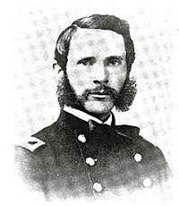 Patrick Henry O'Rorke (1837-1863) - Born 25 Mar 1837 in County Cavan, Ireland. A U.S. Army officer and United States Military Academy graduate who served during the U.S. Civil War and who died 2 Jul 1863 at Gettysburg during that war. He entered the United States Military Academy 1 Jul 1857 and graduated 24 Jun 1861 in the Class of 1861 ranking 1st in his class. This was the second graduating class in 1861 as the U.S. Civil War accelerated graduations. He rose to the rank of Colonel of the 140th New York Infantry in 1862 at age 25. He participated in the siege of Fort Pulaski, the Battle of Fredericksburg and at Chancellorsville. Colonel O'Rorke and the 140th New York arrived at Gettysburg on the second day of the great battle and were immediately pressed into the defense of the strategic Little Round Top. They arrived just as the Confederates were about to overrun Little Round Top and they charged down the hill to repulse the attack. Colonel O'Rorke was killed during a counterattack while holding the colors and urging his men forward. He is buried in Holy Sepulchre Cemetery, Rochester, NY. The monument on Little Round Top to Colonel O'Rorke and the 140th New York Infantry that bears his likeness is shown above. Battery O'Rorke on Fort Barry was named after Colonel Patrick Henry O'Rorke.