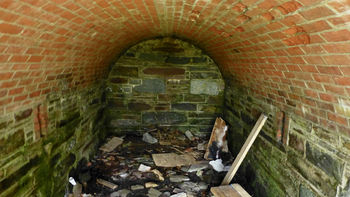 The parapets of the new batteries were thirty feet thick, rising eight feet above the floor of the gun positions. The guns were fired through embrasures cut in the parapet, the faces of which were reinforced with local stone and capped with brick. This design presented only a small opening to seaward, covering the crews during loading and firing. A earth covered masonry “expense” magazine was built between each pair of guns. These magazines also created a protective traverse between each pair of emplacements, to protect gun crews against shells fired up the length of the battery.