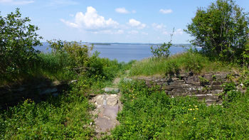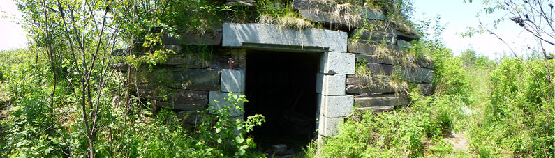 No period guns or mounts in place. The emplacements and at least one magazine can be visited by walking across a field from the road to the crest of the cliff overlooking the harbor entrance. When visited in mid June 2013, the battery was overgrown and difficult to access. One of the magazines was open with some signs of graffiti, some trash and damage. The gun emplacements were overgrown and difficult to make out but the original stone walls can be seen as well as the embrasure cuts. A picture of a 32-pounder on a rotting wood carriage can be seen here on page 12 (original page 16).
